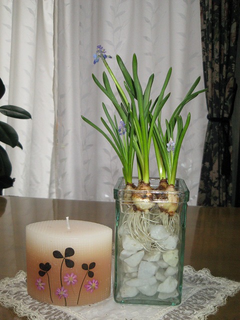 球根を水耕栽培にしました。 キャンドルには、