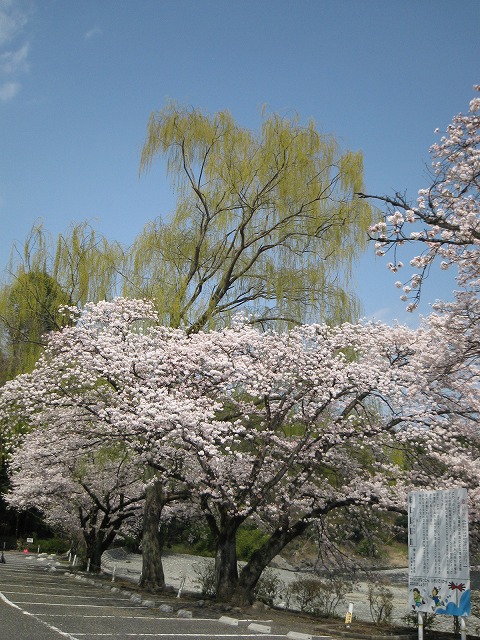 大きな柳の新芽の ライトグリーンと 桜の